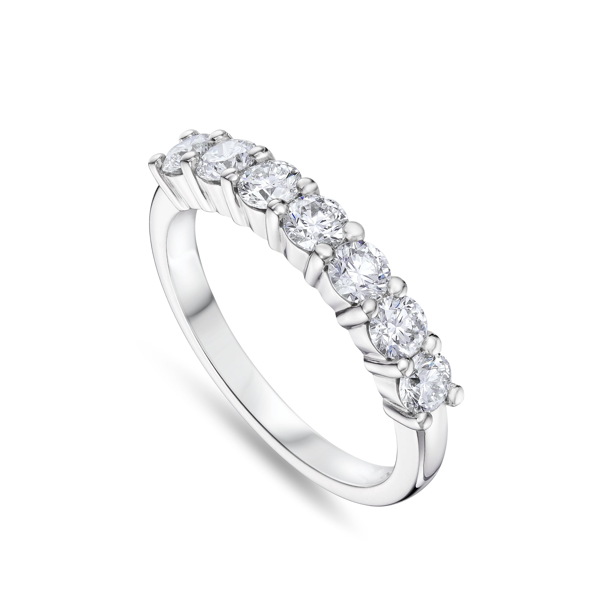 Seven round brilliant cut diamonds are set in platinum across a smooth court shaped band. The low, even profile is comfortable for daily wear and sits neatly alongside engagement and wedding bands. Stones are carefully matched for colour and cut quality to ensure a clean, consistent line of sparkle. Perfect for anniversaries or special occasions.