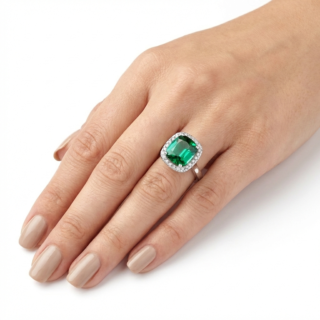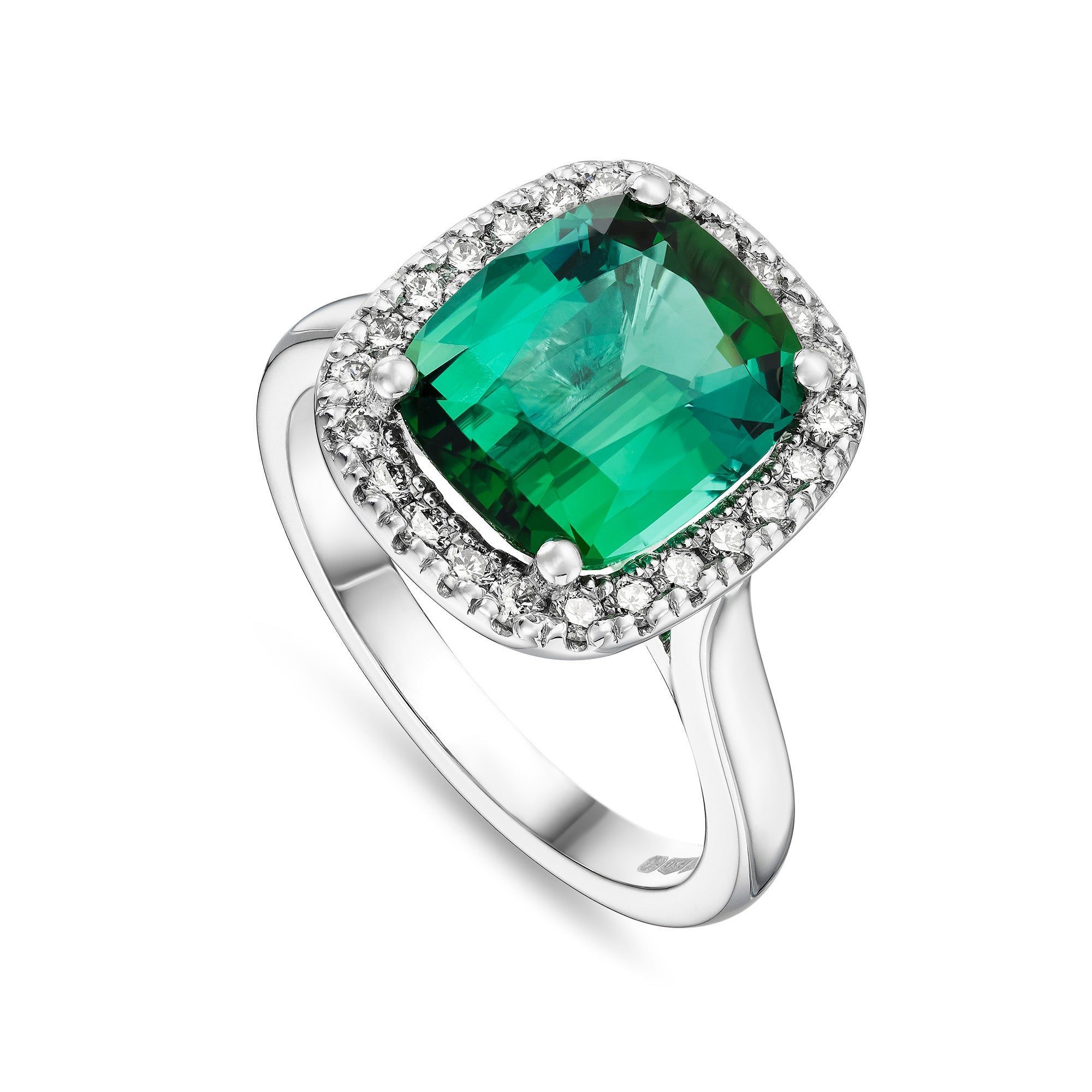 Cushion Cut Green Tourmaline and Diamond Halo Ring in Platinum
