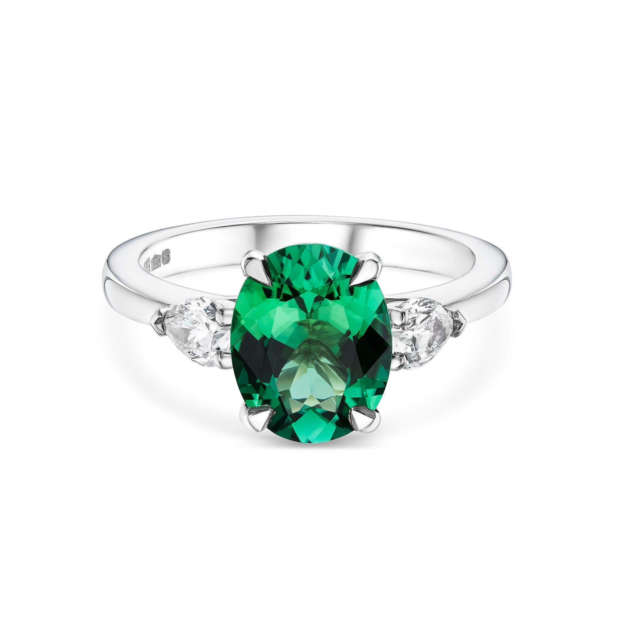 An oval lagoon tourmaline sits at the heart of this platinum ring, its vivid blue-green hue carefully hand-selected for its depth and character. Flanked by pear shaped diamonds, the design draws the eye along the finger while keeping the tourmaline as the clear focus. Crafted in our Jewellery Quarter workshop, it’s a refined tribute to Cheshires’ heritage of fine gemstones and quality craftsmanship.
