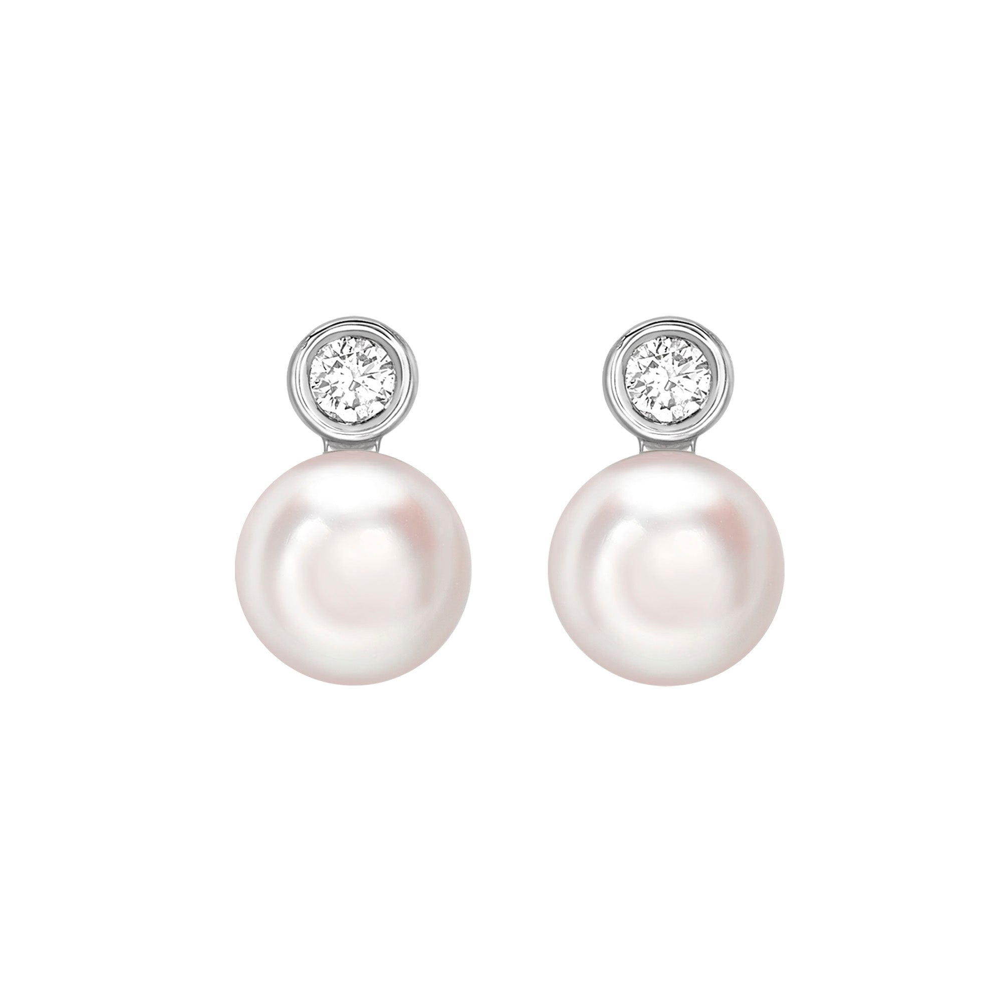 A round brilliant-cut diamond, securely held in a sleek rubover setting, sits above a luminous freshwater pearl. The clean lines of the 18ct white gold enhance the modern simplicity of the design, while the gentle radiance of the pearl adds a touch of timeless elegance. Effortlessly versatile, these earrings offer understated refinement for both everyday wear and special occasions.